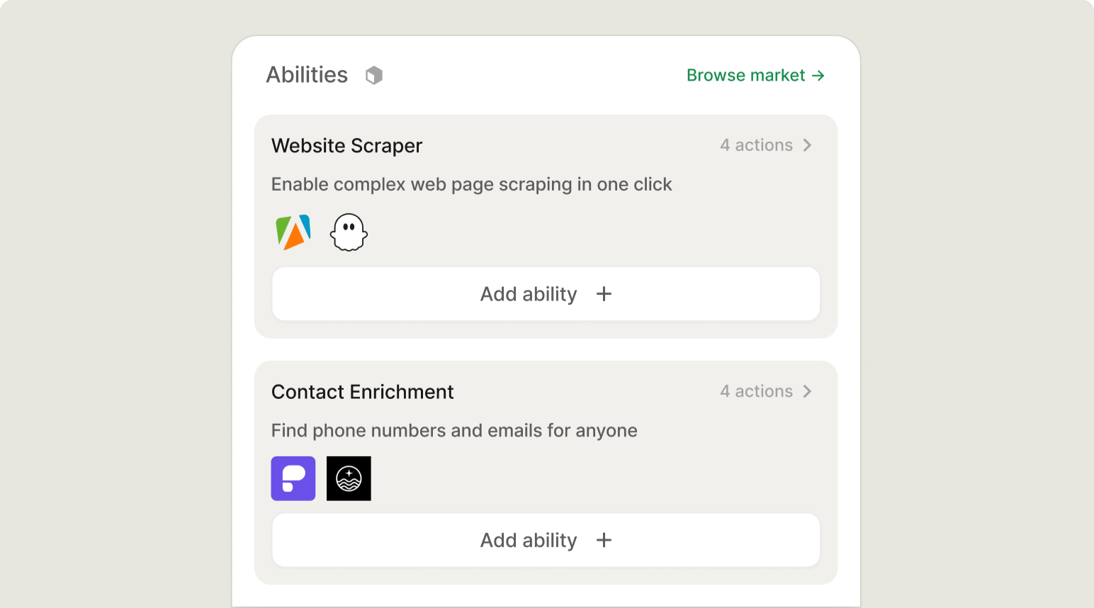 Pre-built tool bundles — scrapers, data providers, best practices, outreach kits. Add to any colleague instantly. No setup.
