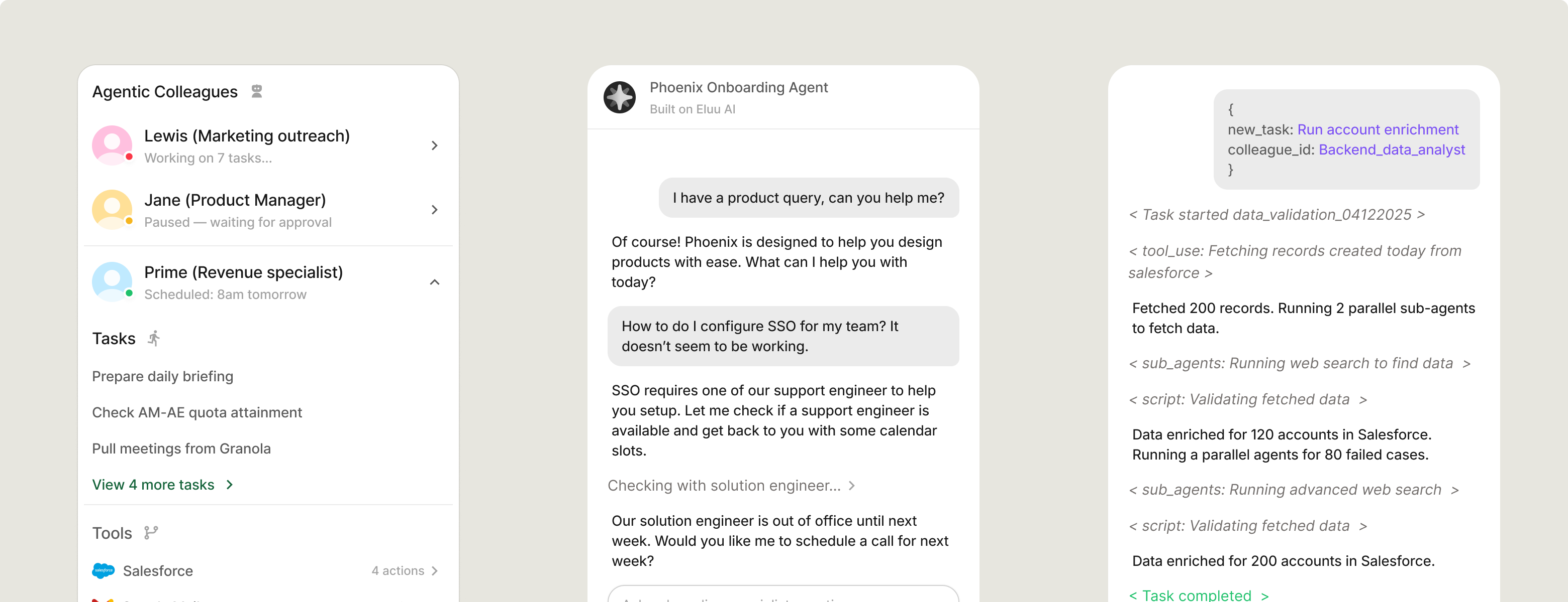 Colleagues aren't limited to one surface. Eluu lets you deploy them wherever work happens — in Slack for your team, embedded in your product for customers, or running in the background through your API. Same platform, same memory, same abilities.