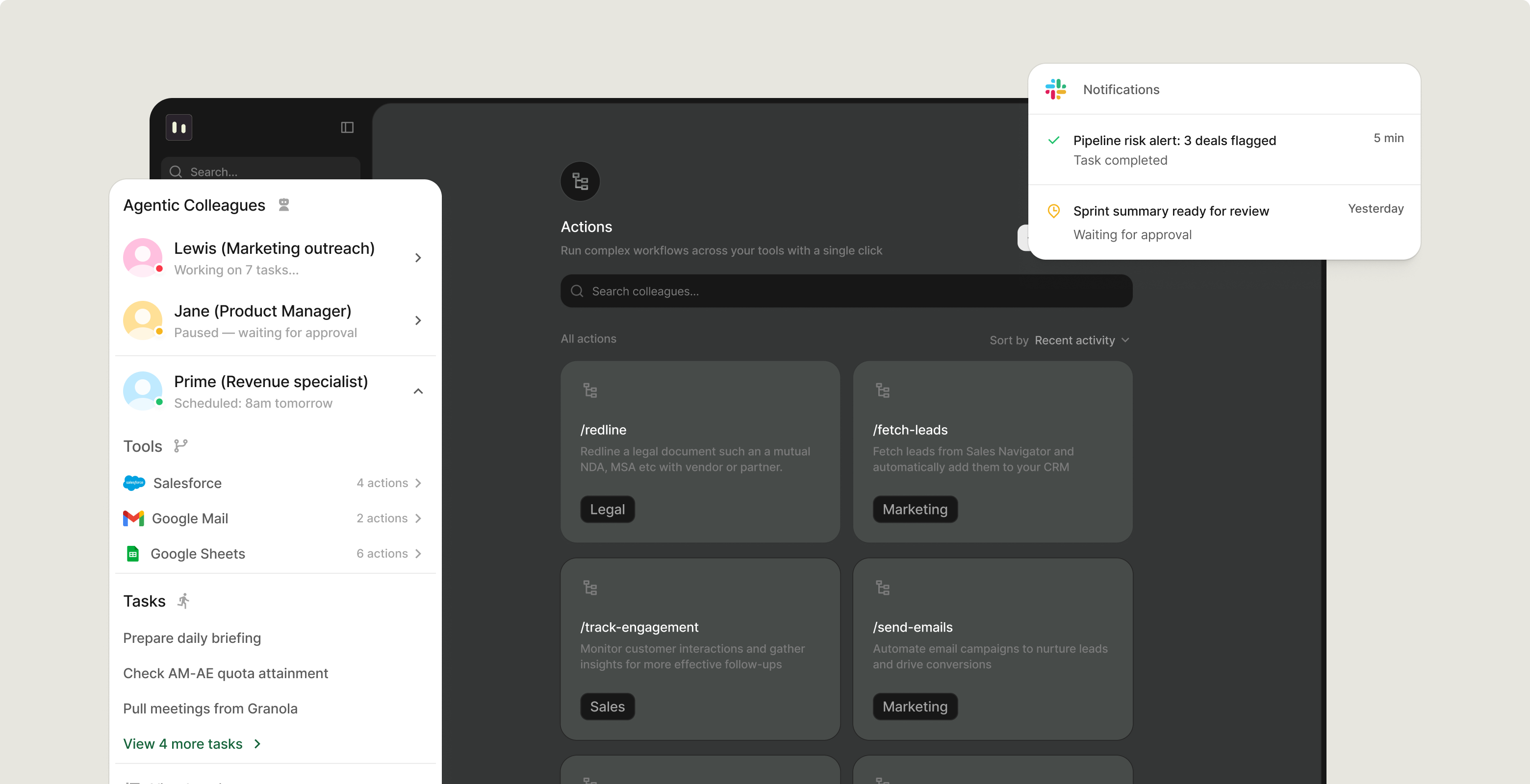 Colleagues that live in Slack, work across your internal tools, and handle recurring work so your team focuses on decisions, not data gathering or repetitive actions.