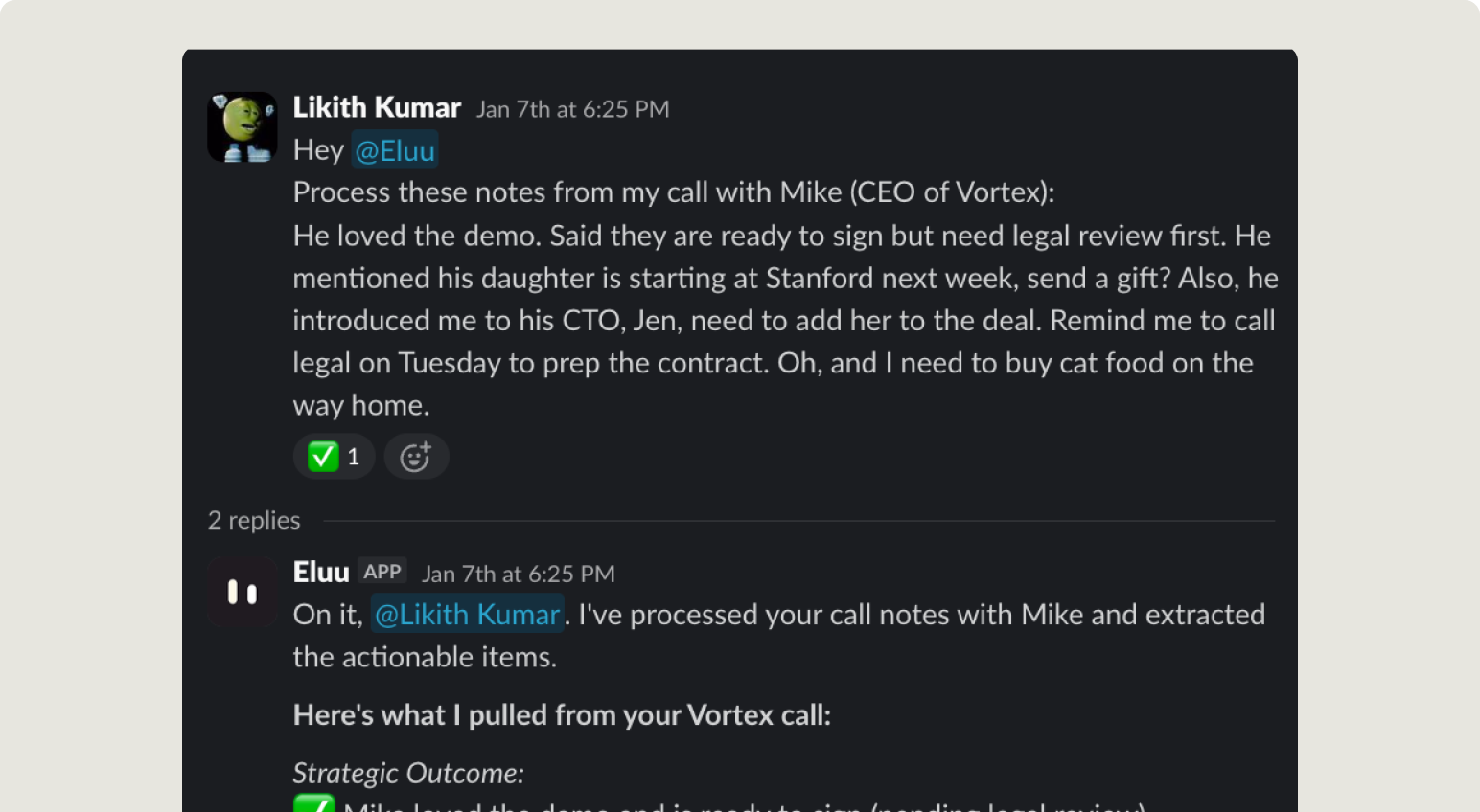 “Eluu colleagues run daily briefings, track pipeline, and flag at-risk deals — all from Slack. What took 2 hours every morning now happens before we are online.”